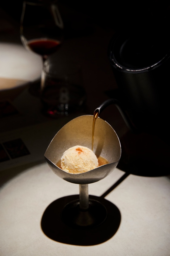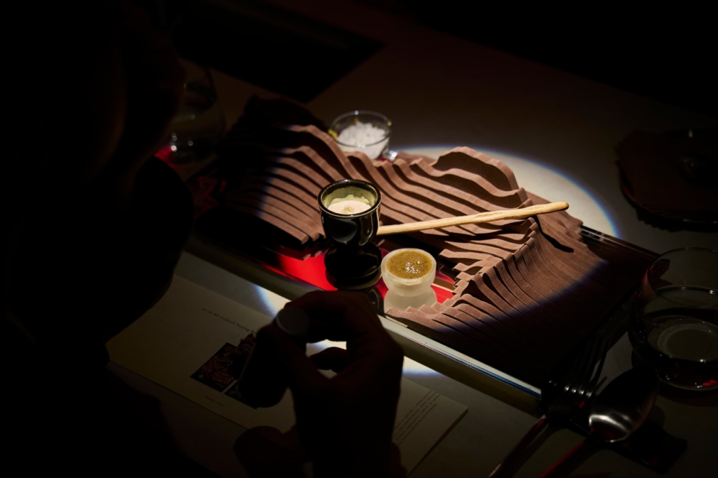 這座奇詭場域同時承載幻象與真實:乾燥炙熱的風裡,隱含來自海洋的鹹鮮與綠洲植被的沁香。透過近乎荒誕的設定,團隊以台灣當季食材與風味作為載體,轉化為一幅幅超現實的異域風景,引導賓客在不斷切換的沙丘場景中,追尋清透、波動的光影與感官層次,完成一場橫跨味覺與身心的探險。