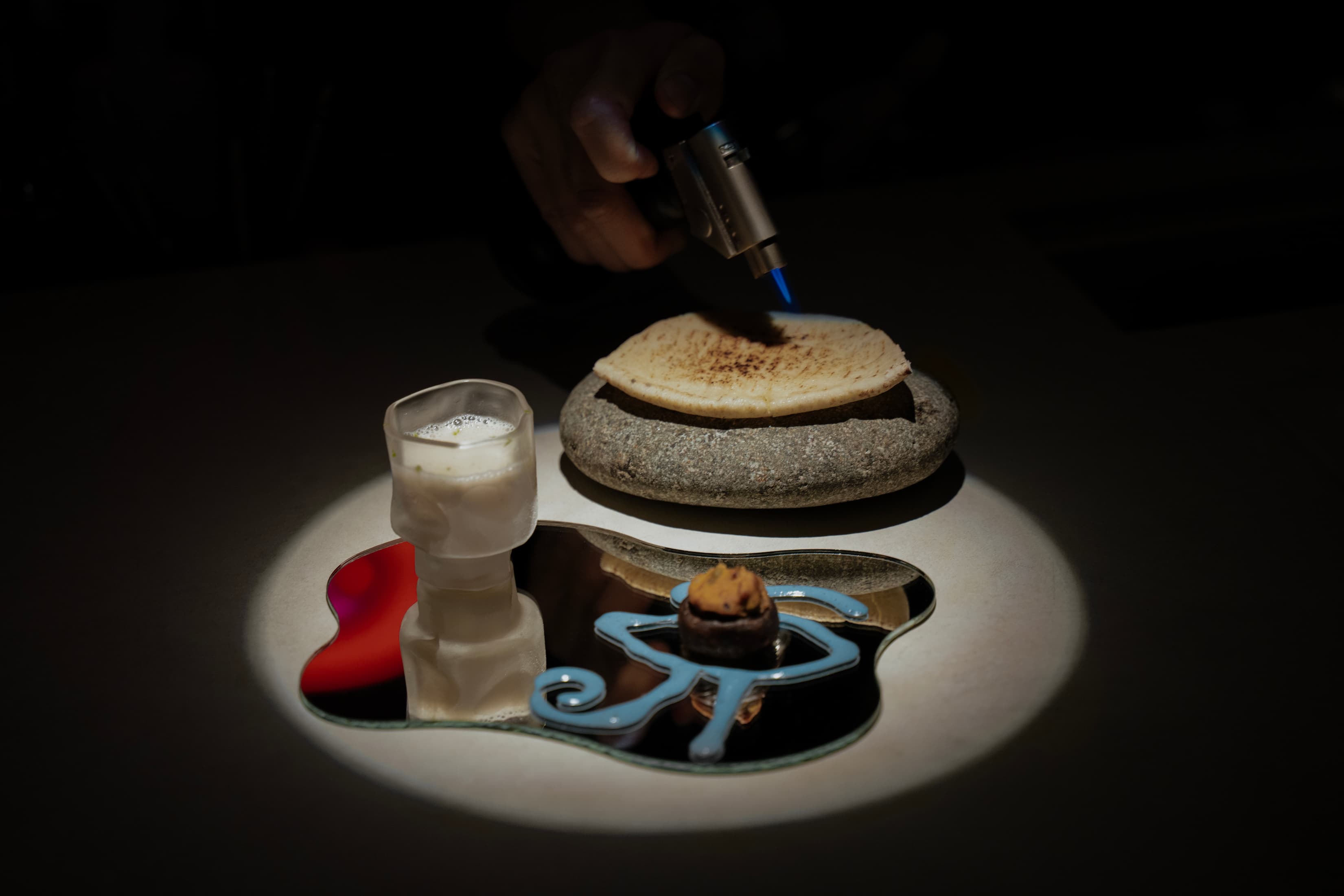 這座奇詭場域同時承載幻象與真實:乾燥炙熱的風裡,隱含來自海洋的鹹鮮與綠洲植被的沁香。透過近乎荒誕的設定,團隊以台灣當季食材與風味作為載體,轉化為一幅幅超現實的異域風景,引導賓客在不斷切換的沙丘場景中,追尋清透、波動的光影與感官層次,完成一場橫跨味覺與身心的探險。