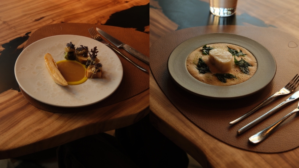 這次品嚐的幾道餐點中,北海道干貝搭配烤蘆筍和煙燻高湯最令人印象深刻,干貝嫩而鮮甜,還有煙燻香氣輕輕點綴;三黃雞主菜則是肉質鮮嫩、醬汁層次分明,讓人回味無窮;至於甜點黃鑽鳳梨佐烤米與茉莉,甜而不膩且塔皮酥脆地剛剛好,為這餐畫上完美句點。