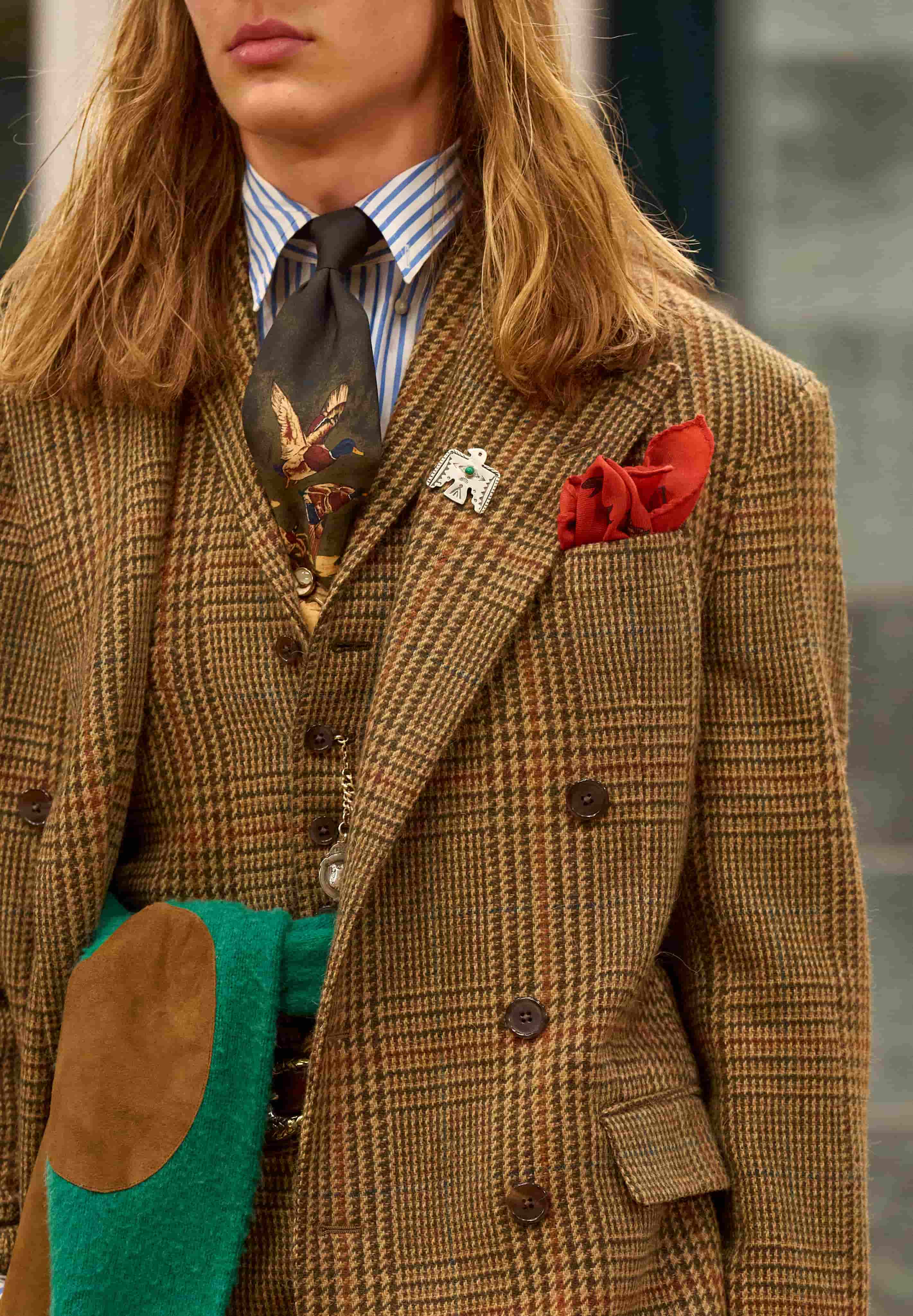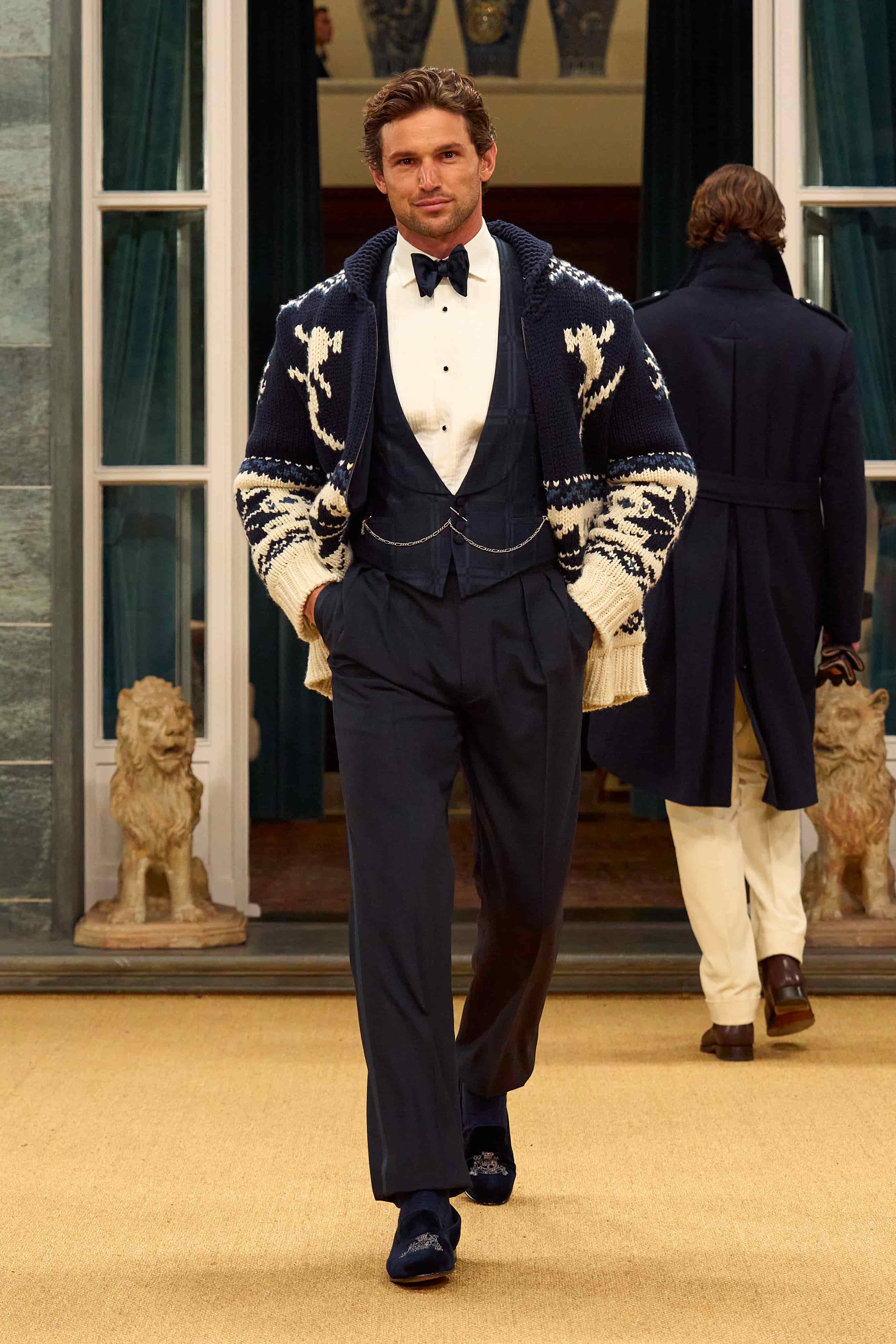 其次,是 Polo Ralph Lauren 與 Purple Label 雙主線同場亮相的罕見安排。在 Ralph Lauren 的美學世界中,這兩者是一位風格男子在不同人生時刻的穿衣狀態:前者是更貼近日常、帶有實驗精神的美式校園風格;後者則是經過時間淬煉後,對工藝、剪裁與質感有更高要求的成熟選擇。兩者並行,為這場秀勾勒出了一條關於成長、歷練與品味轉變的清晰風格軌跡。