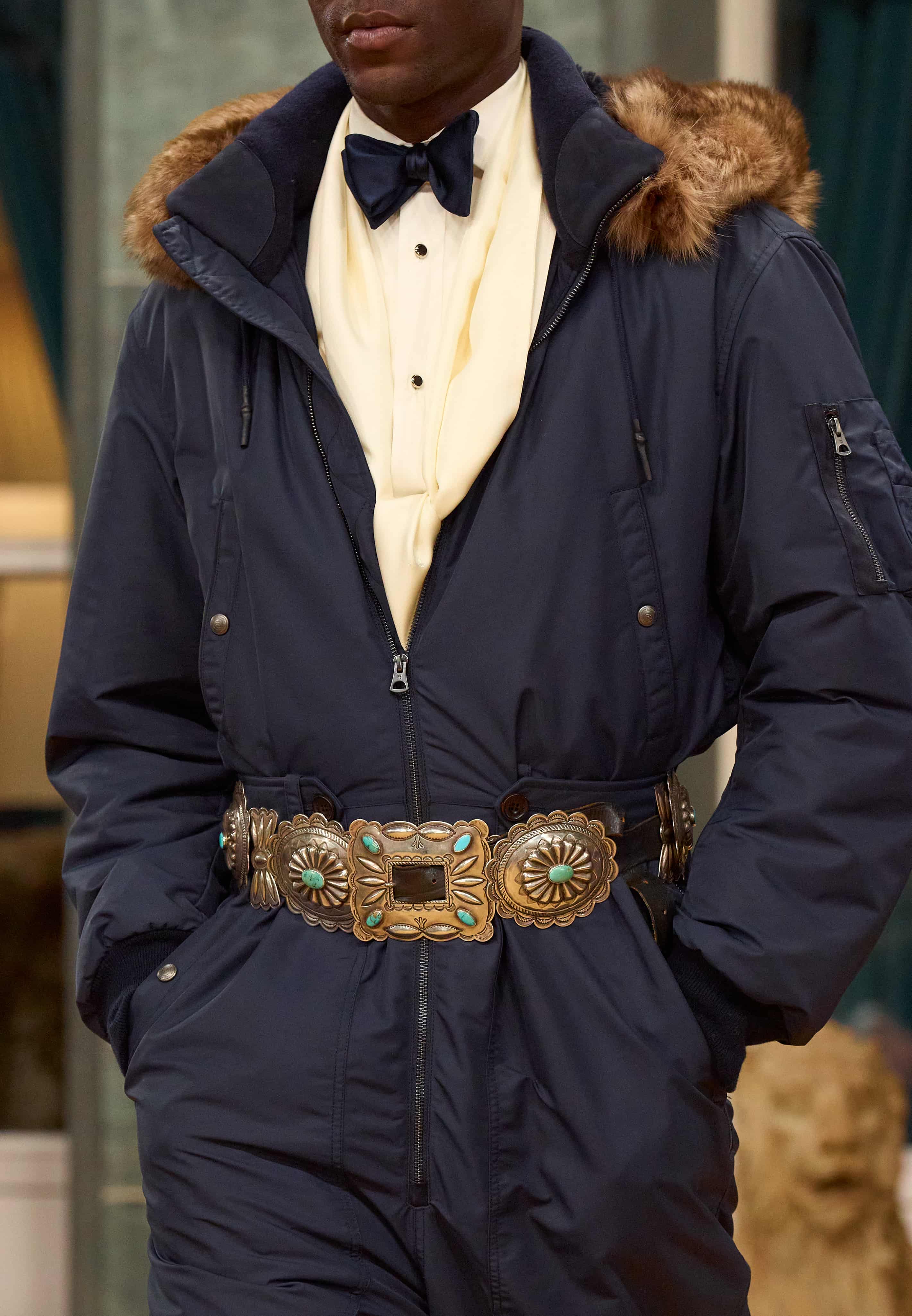Polo Ralph Lauren x TÓPA 系列由 Oceti Sakowin 北美原住民(蘇族)設計師共同創作,北美平原的圖騰語彙被自然融入服裝之中,不作為裝飾,而是成為設計語言的一部分。同時,銀匠藝術家 Neil Zarama 打造的手工腰帶扣與鑲嵌綠松石銀飾,也低調地貫穿兩個系列,成為最耐看、也最有文化重量的細節。這些設計再次提醒我們,Ralph Lauren 所描繪的「美式風格」,從來都是多元文化與真實工藝交織而成。