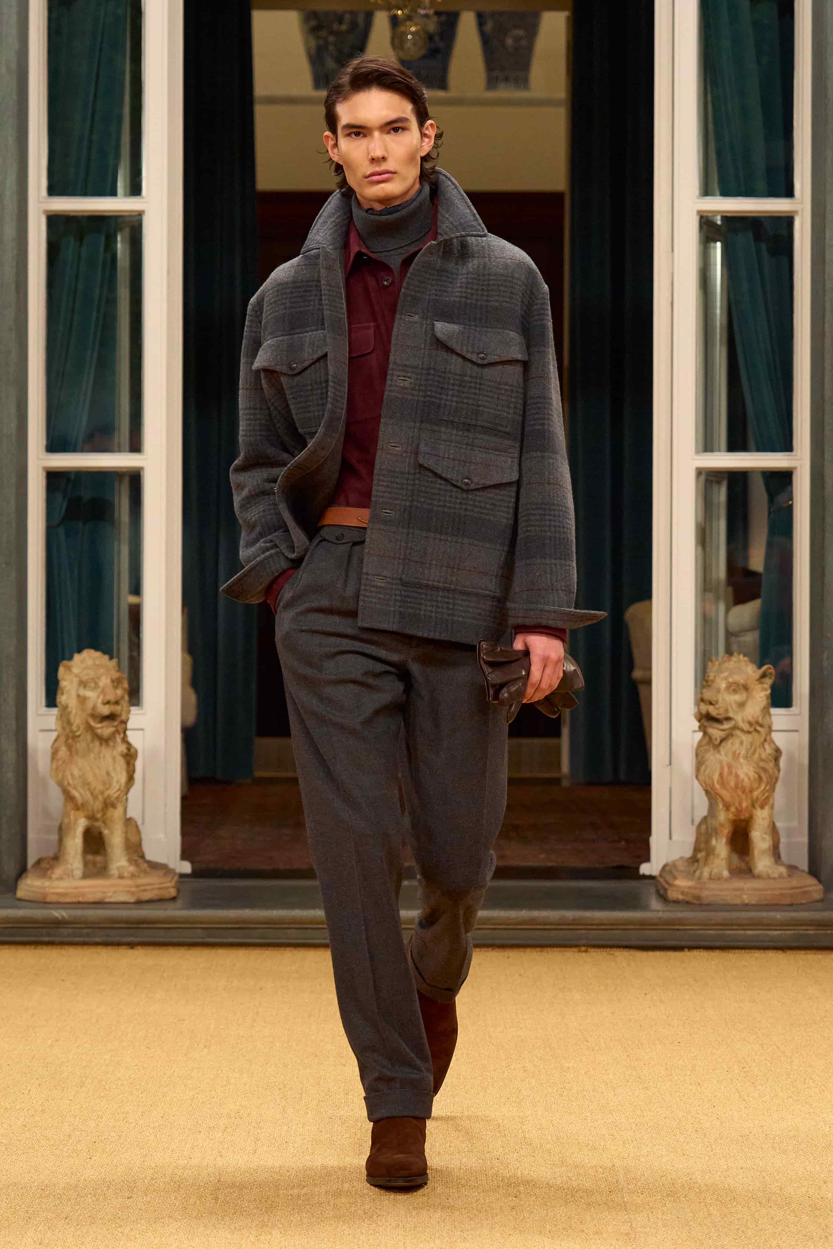 頂級羊絨製成的運動外套、雙面面料的精密工法,以及剪裁極為精準的功能性外衣,在實穿與質感之間取得平衡。即使是晚宴服或手工西裝,也不再被定義為只能出現在正式場合的單品,而是被設計成可以自然融入日常衣櫥的存在。這樣的設計態度,正好呼應 Ralph Lauren 本人所說的——「當我開始設計男裝時,我深受傳統吸引,但從不被其束縛。」