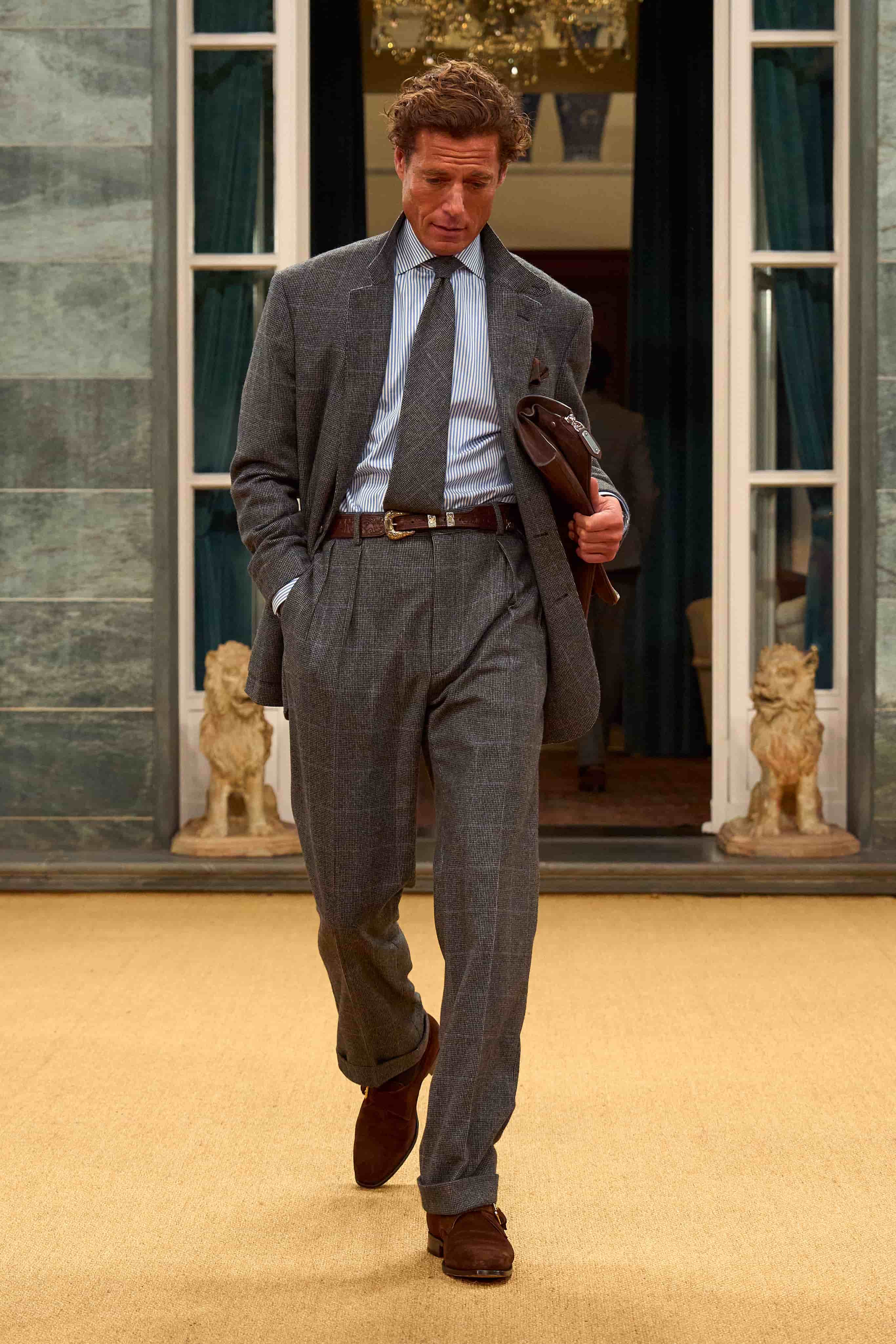 首先,是「時間」本身所承載的意義。對 Ralph Lauren 而言,將近 60 年的品牌歷程從來不只是被回顧的歷史,而是一套仍在持續運作的生活邏輯。這一季選擇回到米蘭,並不是為了重現過去的經典畫面,而是重新梳理品牌長久以來最擅長的命題——服裝如何陪伴一個人走過不同階段,而不是只為某一刻存在。