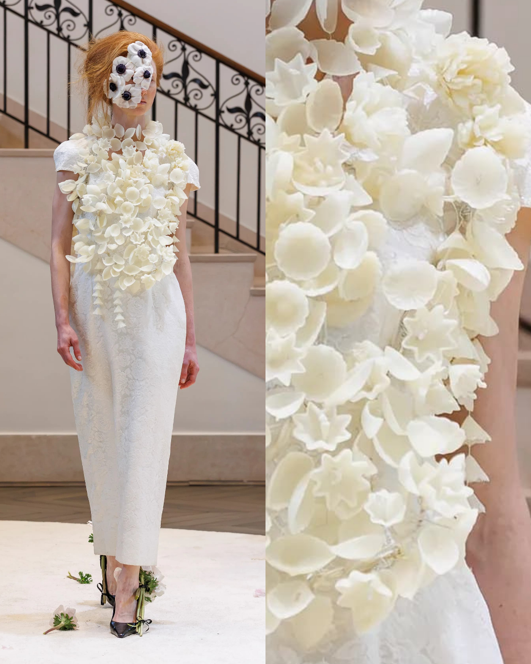 「我也從蠟花中獲得靈感,在復活節時,人們會用蠟做出很大的花束,來裝飾街上的聖人雕像,這是正在消失的傳統,但我找到了還在製作蠟花的匠人,透過奶奶的幫忙,對方甚至願意借給我很古老的模板,而我將蠟花裝飾在母親過去的婚紗上。」