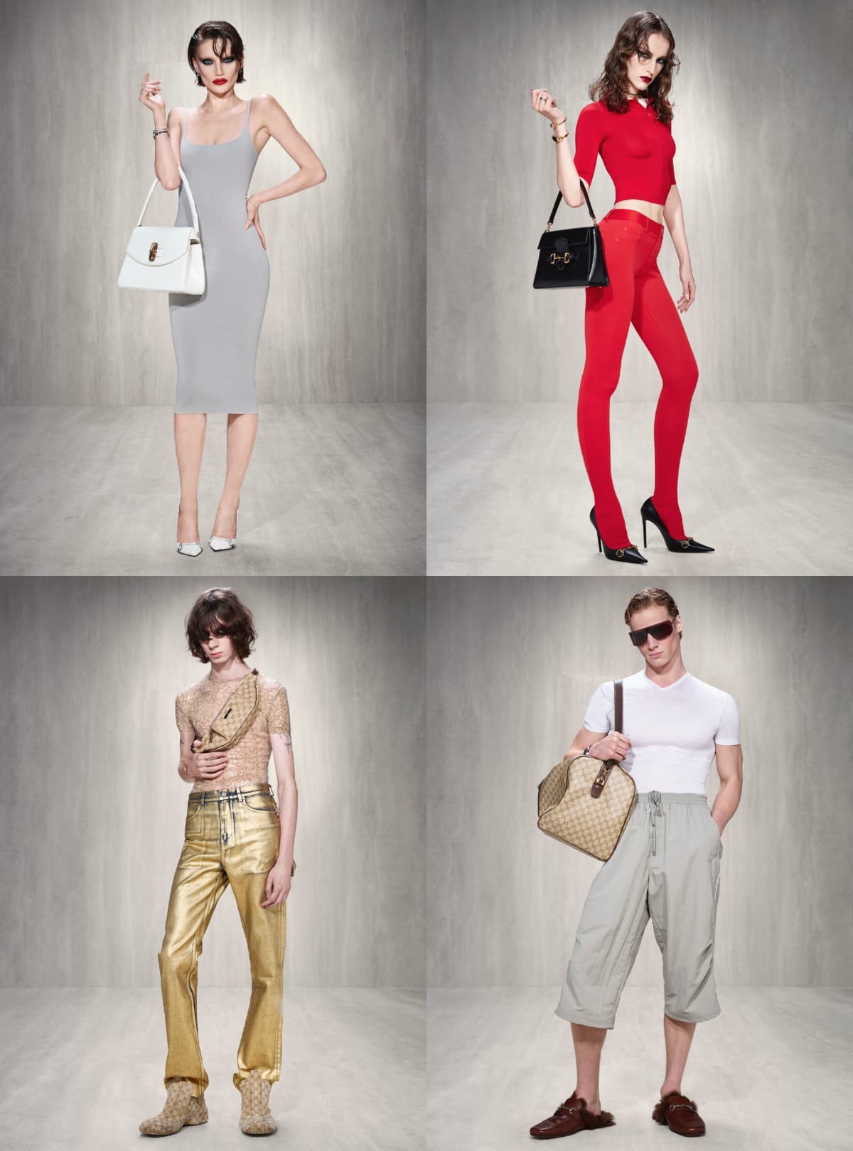 在 2026 Gucci 的秀上,一共展示了 83 套造型,正如他曾說過的,他希望與更廣泛的群體對話,眼前不只是模特兒、有的像是剛從夜店結束狂歡、有的是街頭少年、有的正要去上班、有的剛從健身房出來、有的像是在候機室等待的有錢俗人,不同樣貌、身形、韻味,Demna 正試圖燃起大家對時尚的「慾望」。