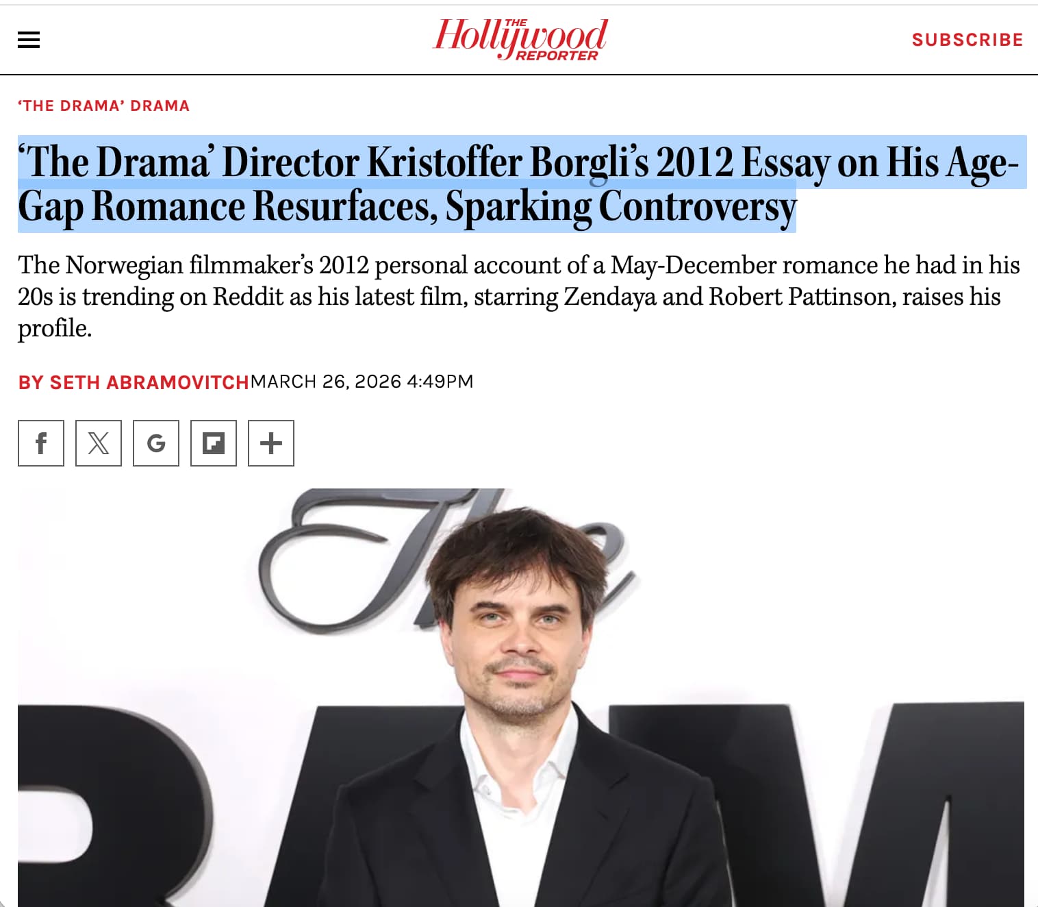 除了上述的大哉問外,導演自身也把一個道德層面問題丟到了現實,根據外媒報導,他 2012 年於挪威報紙上發表過的「老少配」短文近期在網路上流傳,文中講述了,26 歲的他喜歡上了 16 歲的高中生,內容包含了掙扎、從各種「老少配」的電影中尋求慰藉,以及那段關係的美好及狼狽。有外媒懷疑,與其說這是「八卦」,更有可能是導演在做的社會實驗(或對電影的另類宣傳)。所以面對這類 Drama,你想好該怎麼做了嗎?