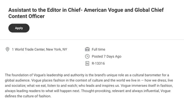 Sammi Tapper 回憶:自己某天晚上吃晚餐時,突然收到一個 LinkedIn 私訊,是 Condé Nast 的招募人員傳來詢問要不要去面試「助理」,「他們沒有用她的名字,而是用她那個很長很長的職稱(Vogue 全球編輯總監、Condé Nast 首席內容長)。基於我根本不在 Vogue 或 Condé Nast 的圈子裡,也不知道那是她的頭銜…。」Sammi Tapper 表示,「我隔天就去面試了,接著五輪非常快的面試,最後一輪是跟 Anna本人,一個星期內我就拿到這份工作。我一拿到 offer 就立刻提離職,然後兩週後就上班了。」